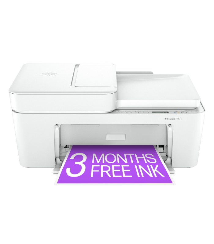 With its 60-sheet paper capacity, auto document feeder, flatbed scanner, and color printing capabilities, the HP DeskJet 4252e All-in-One Printer makes scanning and copying simple. This wireless inkjet printer leads the way in easy, stress-free printing and is ideal for home usage. Print, scan, and copy anything with ease—from your favorite recipes to return labels. With HP+ activation during printer setup, the HP DeskJet 4252e All-in-One Printer also comes with three months of free Instant Ink, allowing you to have ink delivered right to your door and never run out again.