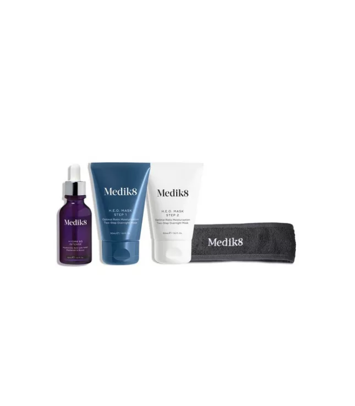 The most cutting-edge hydration heroes from Medik8 will provide skin that is luxuriously soft and deeply moisturised. Use Hydr8 B5 Intense, a supercharged hyaluronic acid serum, to hydrate and firm your skin as part of your Night routine for noticeable effects. A professionally optimised blend of humectants, emollients, and occlusives combined in two steps creates an overnight mask that offers clinically proven hydration for up to 72 hours. Hair can be comfortably kept off your face while you take care of your skin thanks to the incredibly soft Medik8 headband.